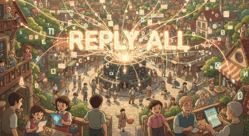 '전자'(electronic) '우편'(email)에서 '메시지'(message)를 '보낸'(sender) 사람뿐만 아니라, '그' '메시지'에 '수신인'(recipient)으로 '포함'(include)된 '모든'(all) '사람'(person)에게 '동시에'(simultaneously) '응답'(reply)하는 '기능'(function)이나 '행위'(action)를 의미합니다. '소통'(communication) '투명성'(transparency)을 높이지만, '불필요'(unnecessary)한 '정보'(information) '유포'의 위험(risk)을 수반합니다.