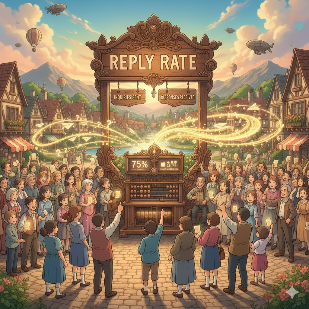 '특정'(specific) '기간'(time period) 동안 '전달'(send)된 '총'(total) '메시지'(messages)나 '질문'(questions)의 '수'(number) 대비, '실제로'(actually) '응답'(reply)이 '되돌아온'(returned) '비율'(rate)을 의미합니다. '마케팅'(marketing)이나 '통신'(communication)의 '효율성'(effectiveness)을 '측정'(measure)하는 '지표'(indicator)로 사용됩니다.