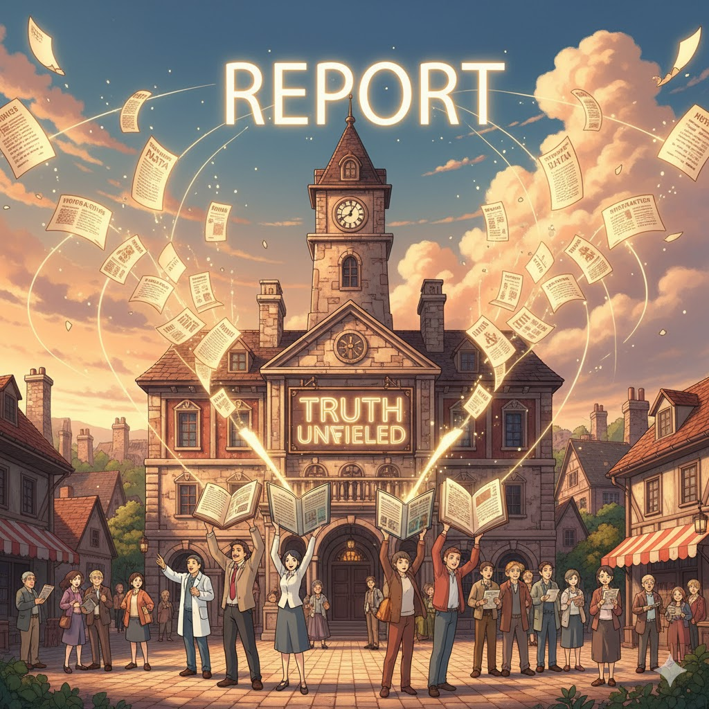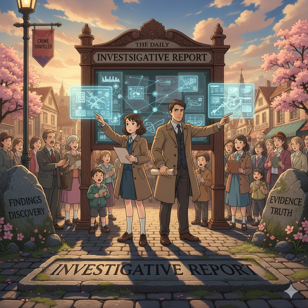 '특정'(specific) '사건'(event), '범죄'(crime), '문제'(problem), 또는 '의혹'(suspicion)에 대해 '경찰'(police), '탐정'(detective), '언론인'(journalist), 또는 '내부'(internal) '감사팀'이 '수행'(perform)한 '조사'(investigation)의 '결과'(result), '사실'(facts), 그리고 '결론'(conclusion)을 '상세히'(in detail) '기록'(record)한 '문서'(document)를 의미합니다. '진실'(truth) '규명'(determination)에 초점이 맞춰집니다.