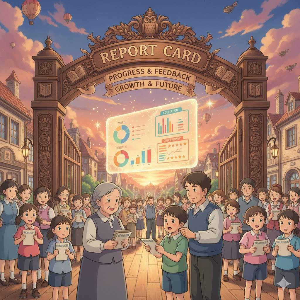 '학생'(student)의 '학업'(academic) '성취'(achievement), '과목'(subject)별 '성적'(grades), 그리고 '태도'(attitude)나 '품행'(conduct)을 '공식적'(official)으로 '평가'(evaluate)하여 '기록'(record)하고 '부모'(parent)에게 '제공'(provide)하는 '문서'(document)를 의미합니다. '교육'(education) '진행'(progress) 상황을 '통보'(notice)하는 역할을 합니다.