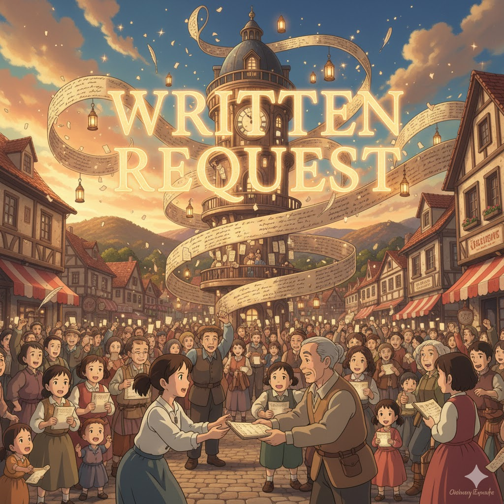 '말'(verbal)이나 '구두'(oral)가 아닌, '글'(written)이나 '문서'(document) '형태'(form)로 '작성'(write)되어 '제기'(make a request)된 '요청'(request)을 의미합니다. '공식적'(official)인 '기록'(record)과 '증거'(evidence) '가치'(value)를 강조하며, '법적'(legal) 또는 '행정적'(administrative)인 '절차'(process)에서 '필수적'(essential)입니다.