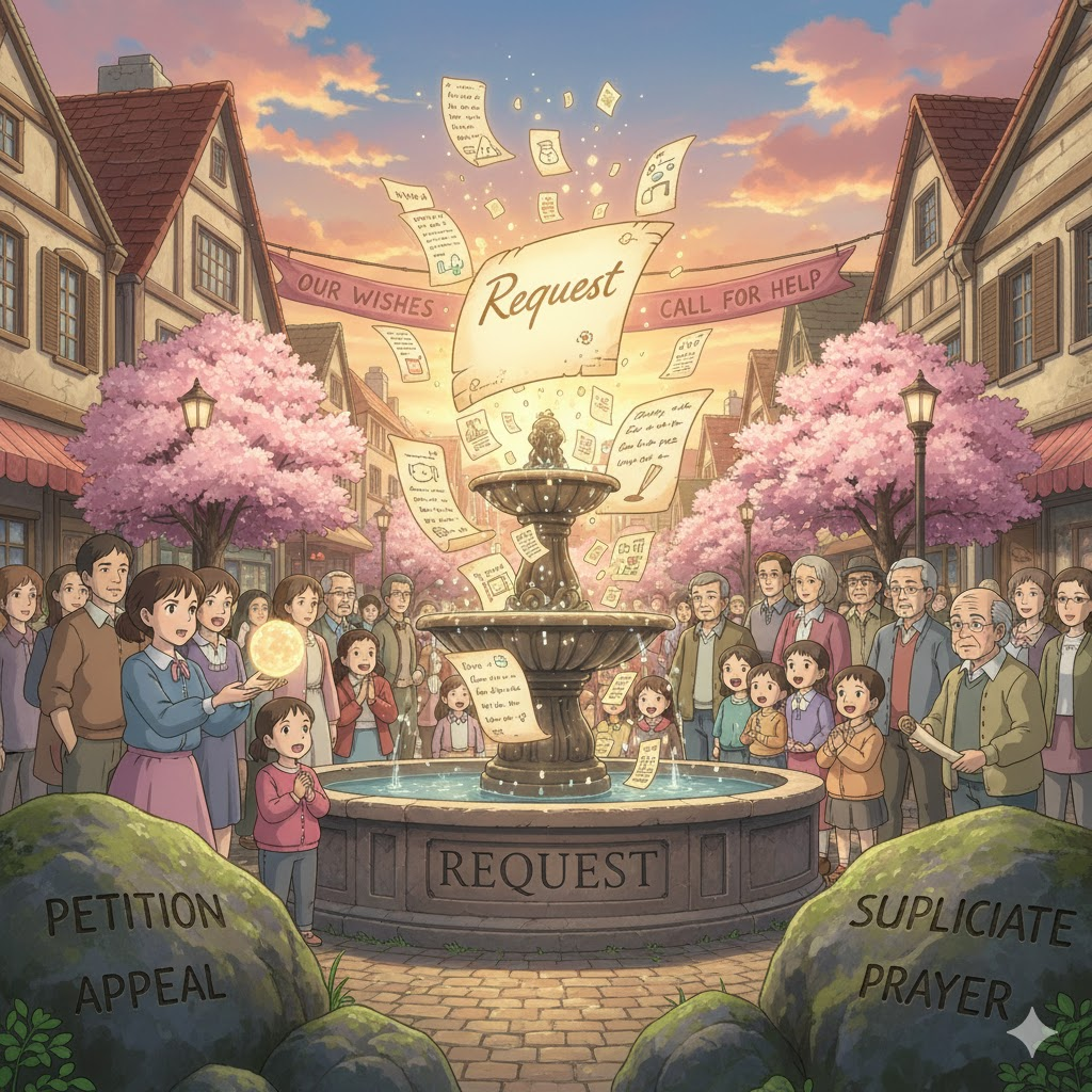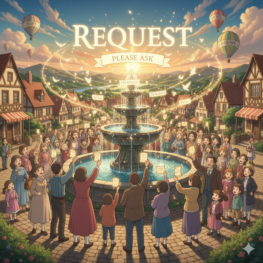 요청, 부탁. 어떤 것을 정중하게 요구하거나 그 요구에 응하는 행위.