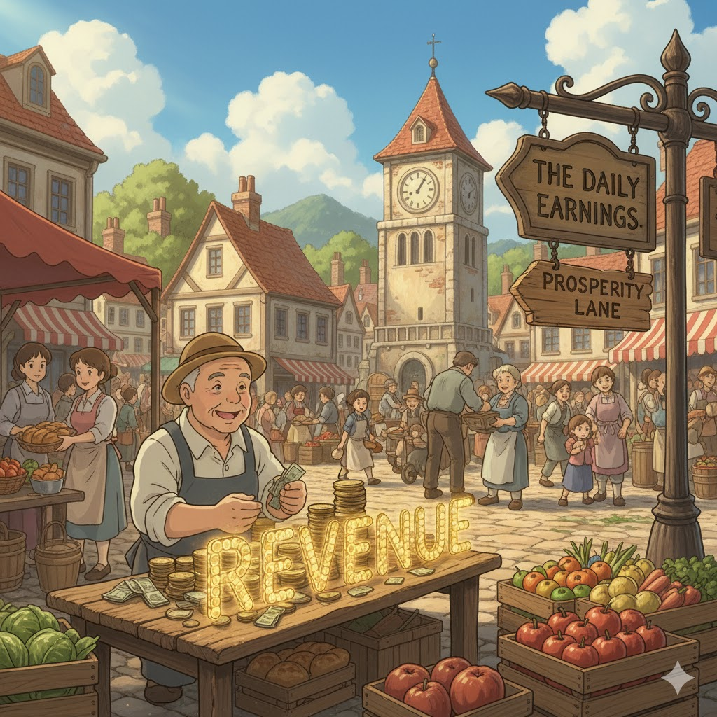 수익, 총수입. 사업이나 활동을 통해 정기적으로 발생하는 금전적 유입.