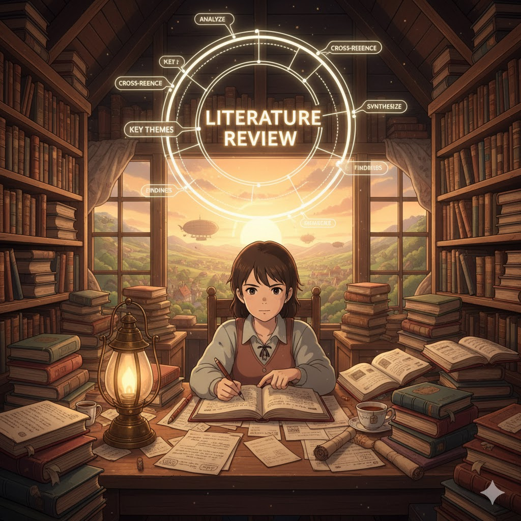 - 해석: 특정 주제에 대해 기존에 발표된 모든 학술 자료를 조사하고 비평적으로 요약하는 연구의 필수 단계. (학술 지문에서 가장 중요)