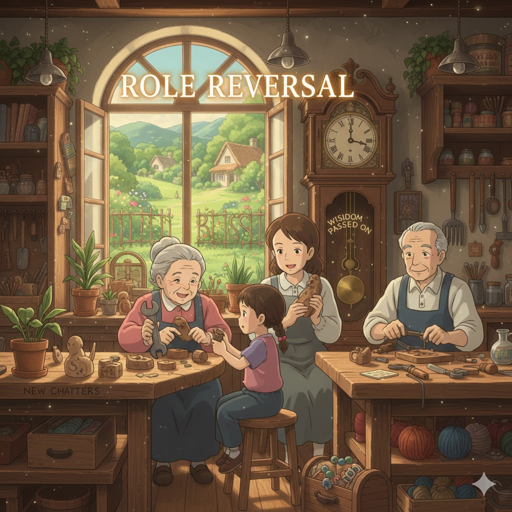 '이전에'(former) '정해져'(set) 있거나 '전통적'(traditional)으로 '기대'(expectation)되던 '두'(two) '사람'(person)이나 '집단'(group)의 '역할'(role)이나 '지위'(status)가 '서로'(each other) '뒤바뀌는'(reverse) 현상을 의미합니다. '부모'(parent)와 '자녀'(child), '상사'(superior)와 '부하', 또는 '성별'(gender) '역할'의 '변화'(change)를 강조합니다.