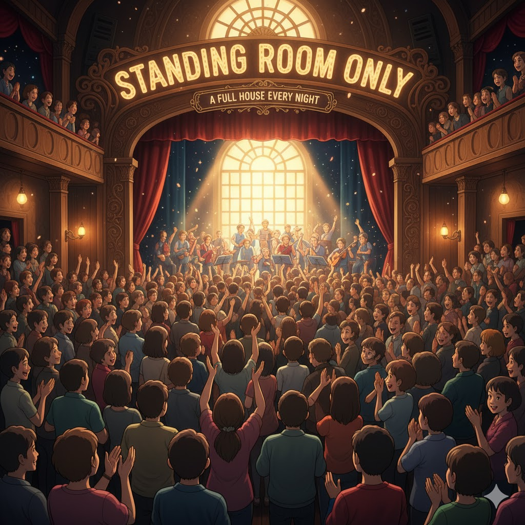 - 해석: 모든 좌석이 가득 차서 서서 관람하거나 참여해야 하는 상태. (매우 인기 있는 행사)