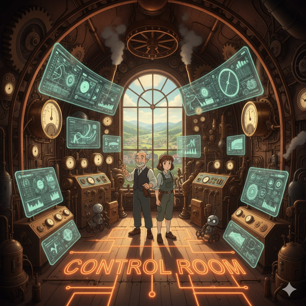 '공장'(factory), '시스템'(system), '발전소', 또는 '방송'(broadcast) '센터'의 '작동'(operation)을 '감시'(monitor), '조정'(adjust), 그리고 '지시'(direct)하는 '기술적'(technical) '장비'(equipment)가 '설치'(set up)된 '중앙'(central) '방'(room)을 의미합니다. '안전'(safety)과 '효율성'(efficiency) 확보를 위한 '통제'(control)의 '핵심'(core) '위치'(position)를 강조합니다.