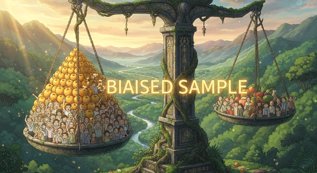 - 해석: 모집단의 특정 특성이 과도하게 또는 부족하게 반영되어 전체 집단을 정확히 대표하지 못하는 표본. (통계적 오류 관련 지문에서 중요)