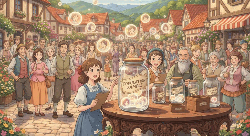 - 해석: 인구 집단 전체에서 선택된 부분 집단 (표본).