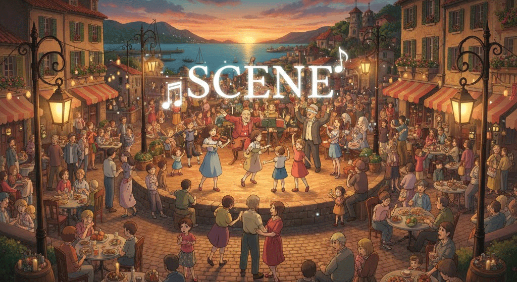 'crime/accident scene'은 사건 현장을, 'local scene'은 지역 문화를, 'change of scene'은 분위기 전환을, 'make a scene'은 소란 행위를, 'scene setter'는 배경 설정을 의미합니다.