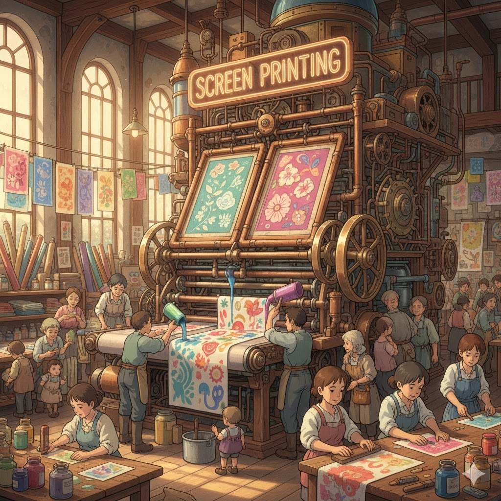 '잉크'(ink)를 '특정'(specific) '모양'(pattern)을 '따라', '천'(fabric)이나 '종이'(paper)와 같은 '표면'에 '압력'(pressure)으로 '통과'(pass)시켜 '이미지'(image)나 '텍스트'(text)를 '전달'(transfer)하는 '인쇄'(printing) '기술'(technology)을 의미합니다. '대량'(large quantity) '생산'(production)과 '선명한'(vivid) '색상'(color) '표현'(expression)에 초점이 맞춰집니다.