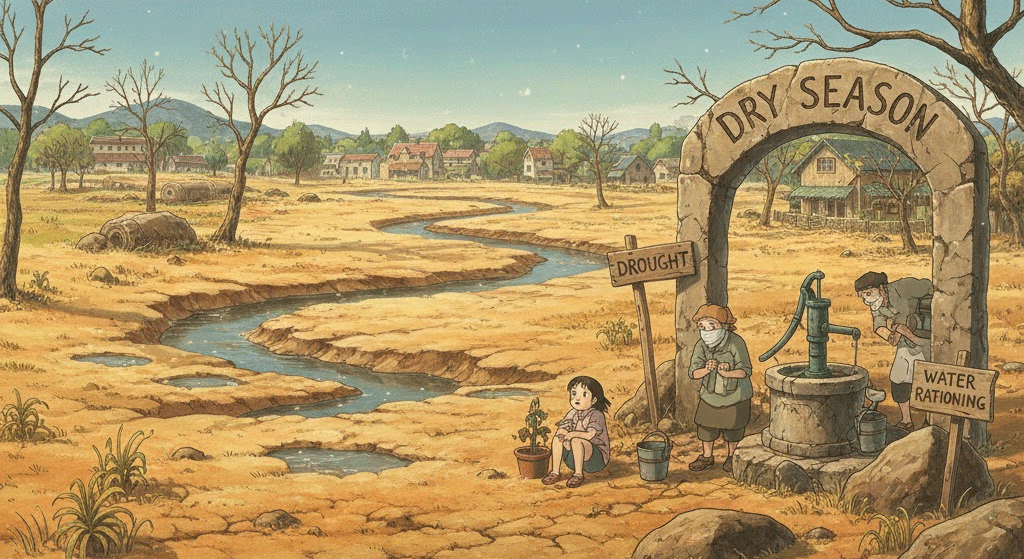 '1년'(year) 중 '특정'(specific) '지역'(area)에서 '비'(rain)가 '가장'(most) '적게'(little) '내리고'(fall), '습도'(humidity)가 '낮은'(low) '시기'(season)를 의미합니다. '가뭄'(drought)과 '물'(water) '부족'(shortage)의 '위험'(risk)이 '높은'(high) '기상'(weather) '현상'(phenomenon)을 강조하며, 'rainy season'과 대비됩니다.