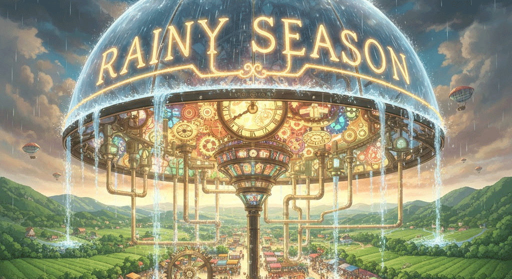'1년'(year) 중 '특정'(specific) '지역'(area)에서 '비'(rain)가 '가장'(most) '많이'(heavy) '내리고'(fall), '습도'(humidity)가 '높은'(high) '시기'(season)를 의미합니다. '농업'(agriculture)과 '수자원'(water resources) '관리'(management)에 '영향'(impact)을 미치는 '기상'(weather) '현상'(phenomenon)을 강조합니다.