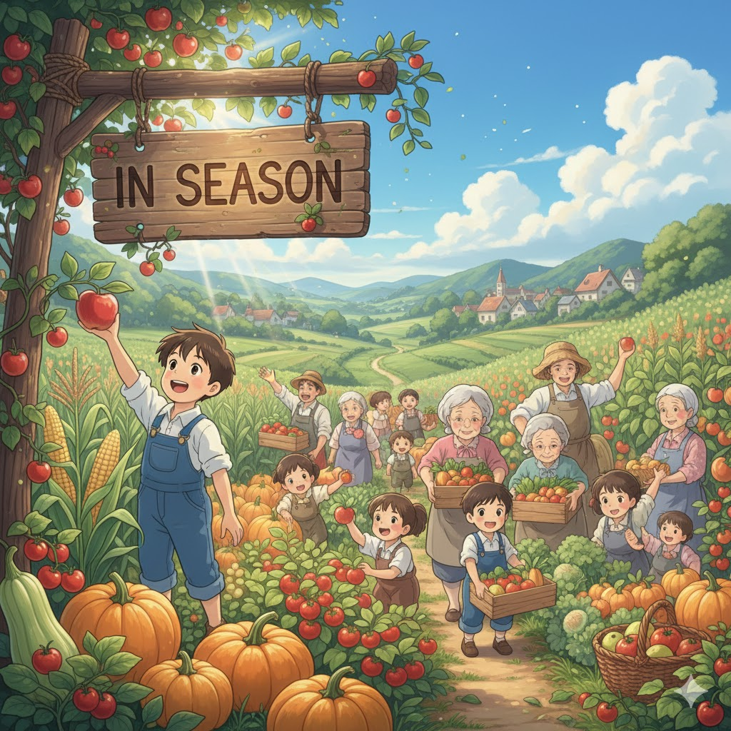 - 해석: 과일, 채소, 또는 상품이 수확되거나 생산되는 적절한 시기에 있어 품질이 좋고 저렴한 상태. (out of season과 대비)