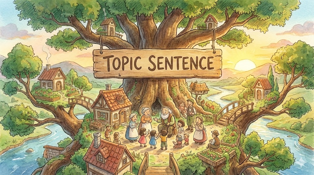 - 예문: A well-written essay has a clear topic sentence at the beginning of every body paragraph. (잘 쓰인 에세이는 모든 본론 단락의 시작에 명확한 주제 문장을 가진다.)