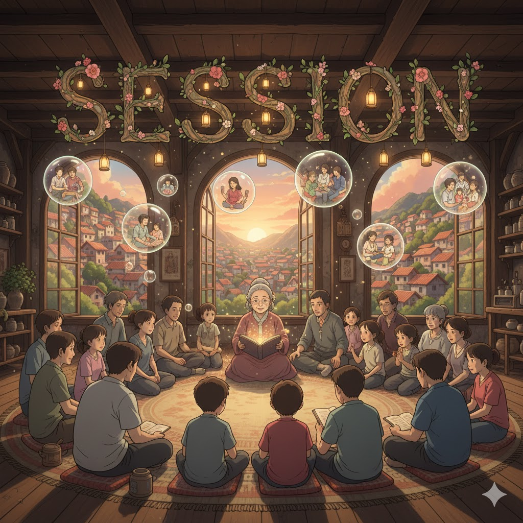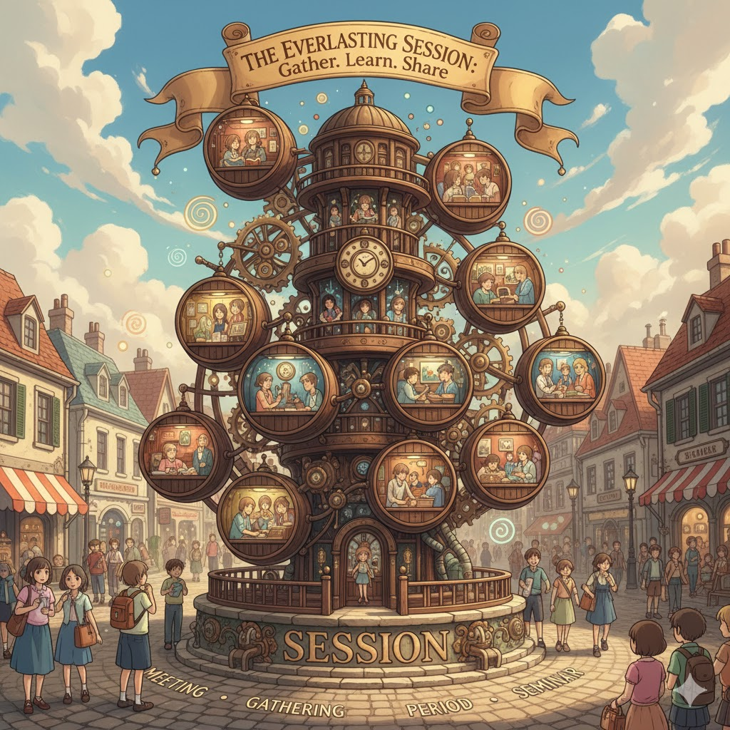 | 라틴어 sessiō (앉음, 회의) | "함께 앉아 진행하는 모임" | 회의 시간/기간 → 학기/수업 시간 → 법정 회기 → 컴퓨터 접속 기간 |