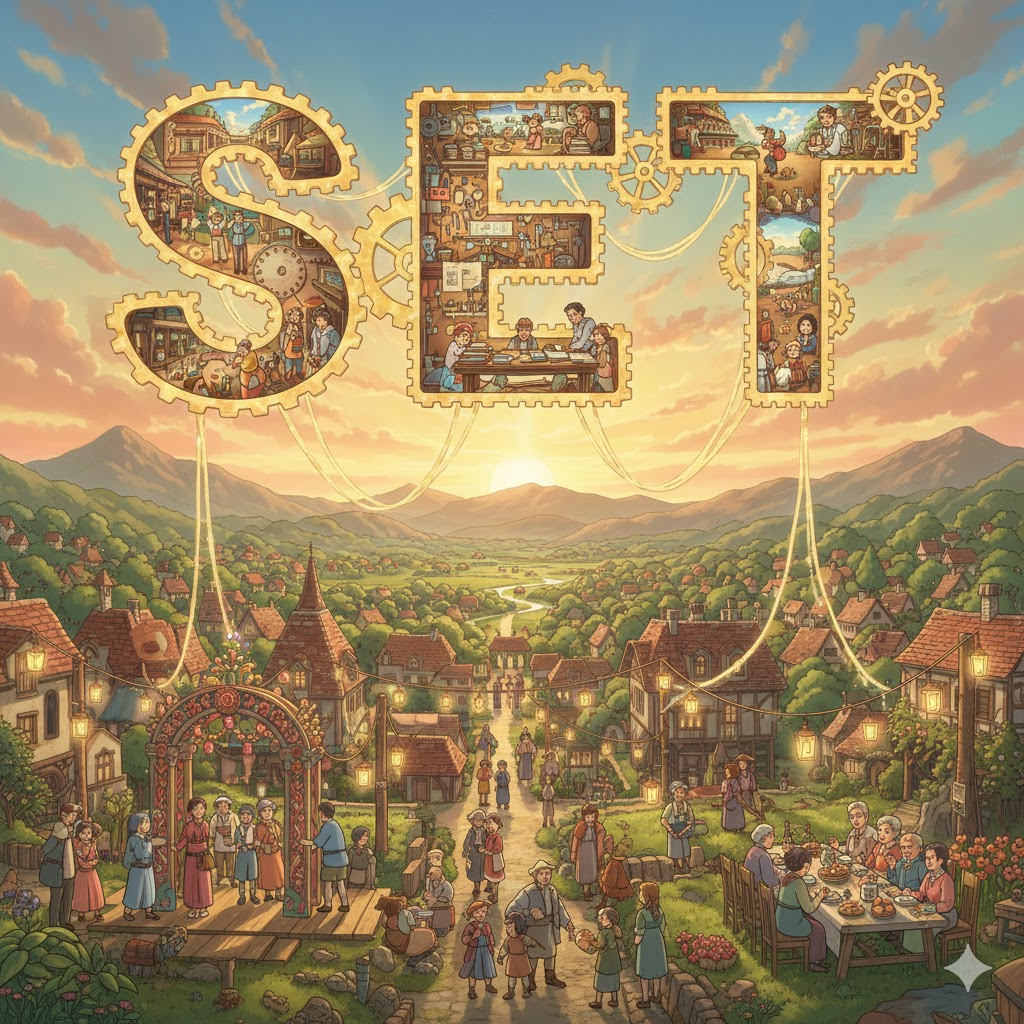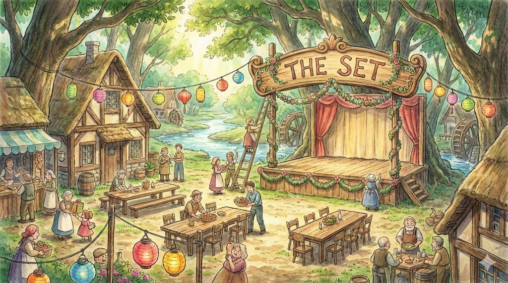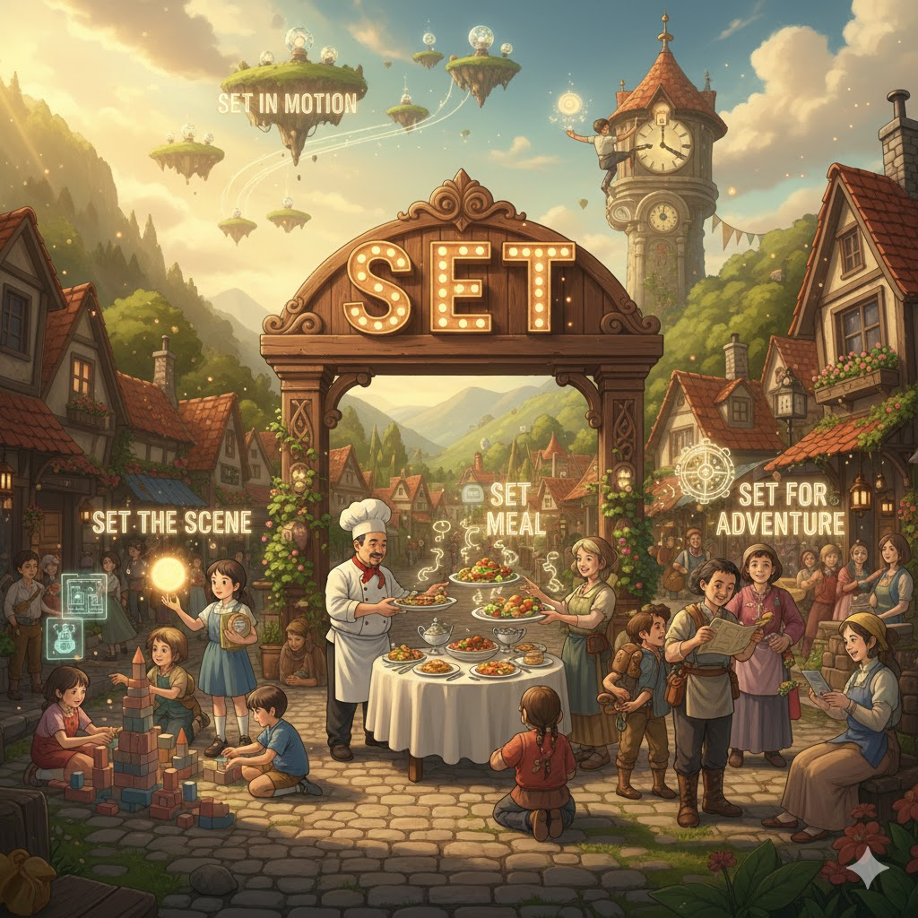 | 고대 영어 settan (자리에 앉히다) | "특정한 곳에 확정적으로 두다" | 설치/배치하다 → 규칙/기준을 정하다 → 해가 지다 (내려앉다) → 집합/세트 |