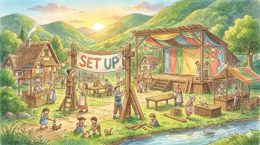 - 예문: We need to set up the projector and sound system before the presentation begins. (발표가 시작되기 전에 프로젝터와 음향 시스템을 설치해야 한다.)