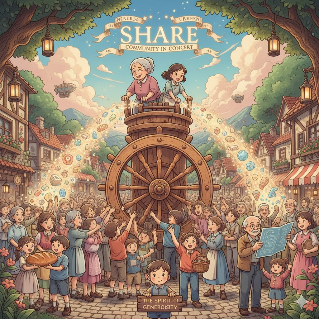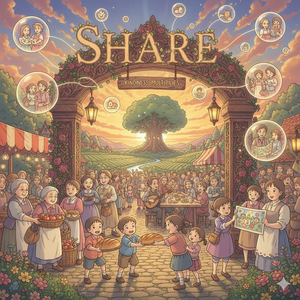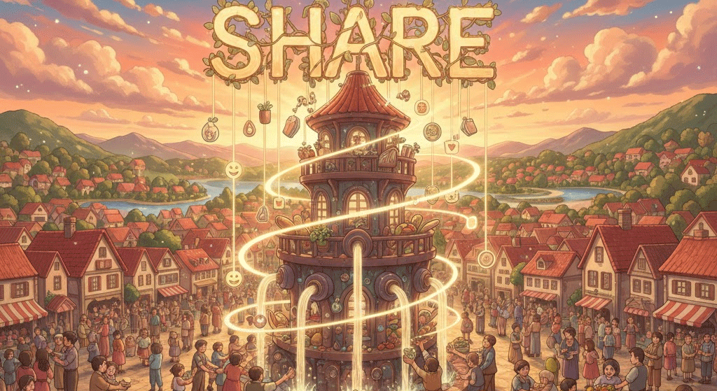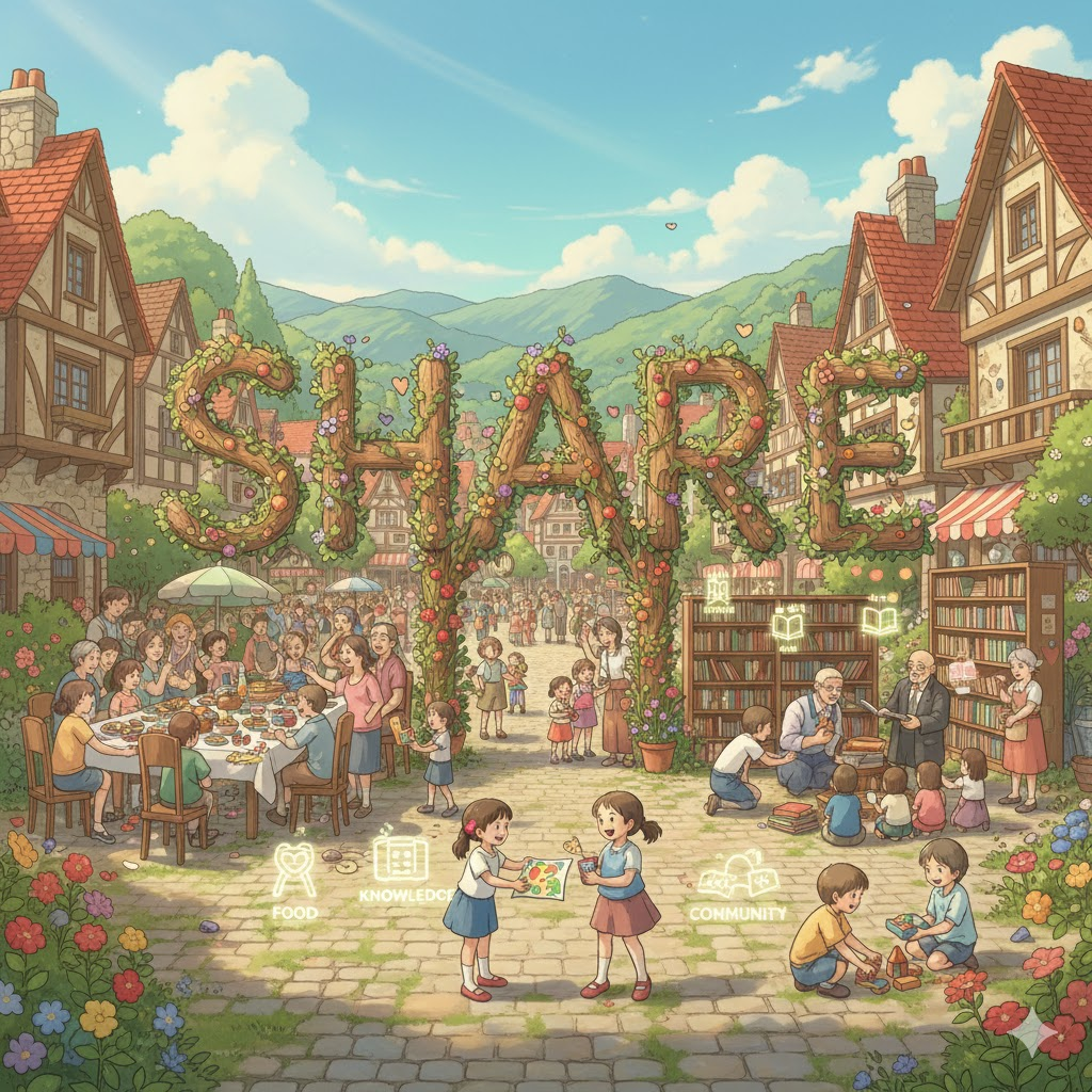 공유하다, 나누다. 어떤 대상(물질, 감정, 생각)을 다른 사람들과 함께 나누는 행위.