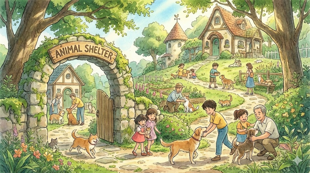 - 해석: 버려지거나 학대받은 동물을 보호하고 돌보며 새로운 입양처를 찾아주는 시설. (윤리, 사회 복지 지문에서 중요)