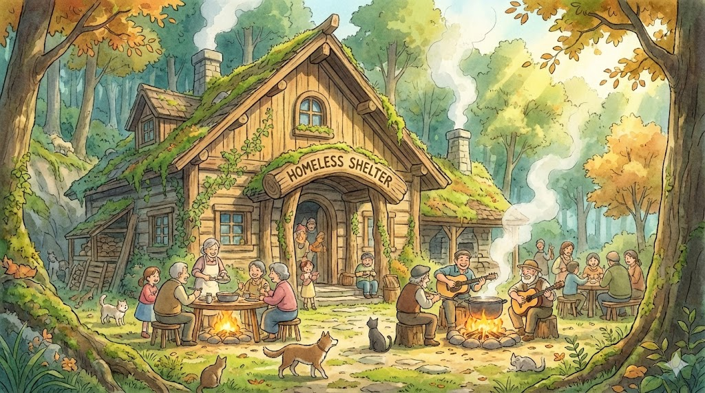 '집'(home)이 '없거나'(homeless) '궁핍한'(destitute) '사람들'(people)에게 '임시적'(temporary)인 '주거'(housing), '음식'(food), 그리고 '지원'(support) '서비스'(service)를 '제공'(provide)하는 '시설'(facility)을 의미합니다. '사회'(social) '복지'(welfare)와 '빈곤'(poverty) '감소'(reduction)의 '문제'(issue)에 초점이 맞춰집니다.