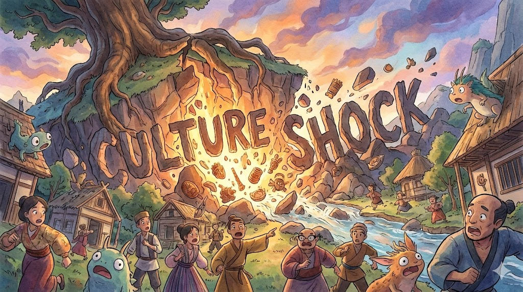 - 예문: Moving to a country with entirely different social norms caused severe culture shock for the immigrant. (완전히 다른 사회 규범을 가진 나라로 이주하는 것은 그 이민자에게 심각한 문화 충격을 야기했다.)