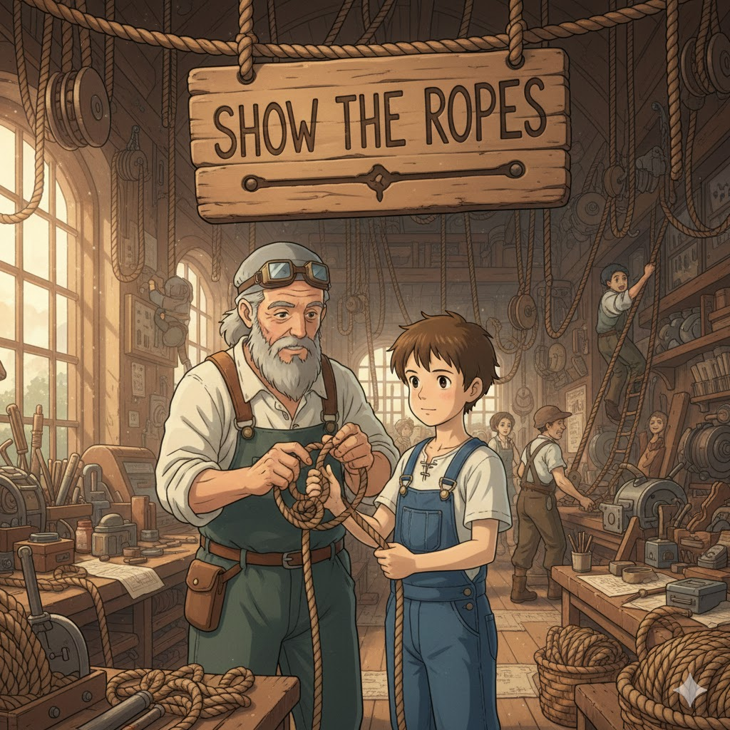 - 예문: The senior manager spent the morning showing the intern the ropes. (선임 매니저는 인턴에게 요령을 가르쳐 주는 데 오전을 보냈다.)