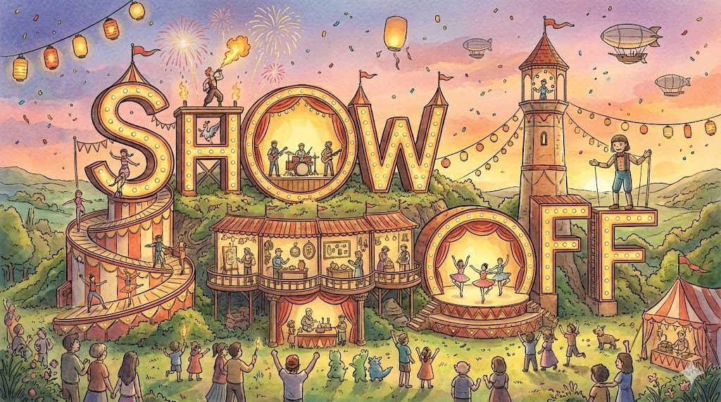 - 해석: 자신의 능력, 소유물, 또는 외모를 남들이 주목하도록 드러내어 자랑하는 행위.