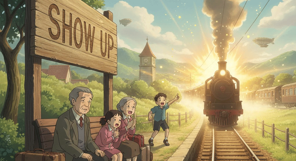 - 해석: 약속 장소나 모임에 도착하거나 모습을 드러내는 행위. (도착의 뉘앙스)