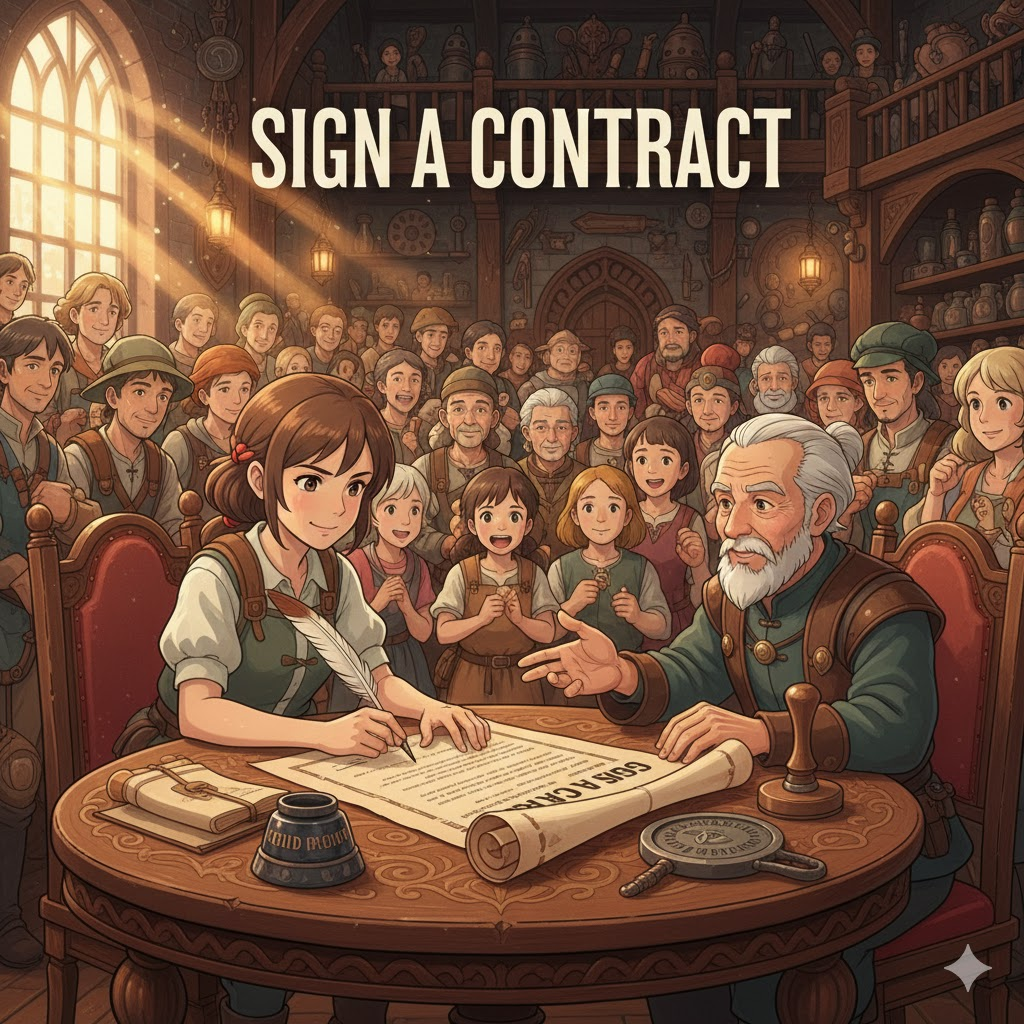 - 해석: 공식적인 합의를 맺고 법적 효력을 발생시키기 위해 문서에 이름을 적는 행위.