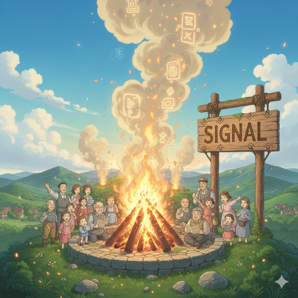 과거에 먼 거리(distance)에서 의사소통(communication)하거나 경고(warning)를 보내기 위해 불(fire)을 피워 연기(smoke)의 모양이나 패턴(pattern)으로 메시지(message)를 전달하던 고대(ancient) 통신 수단을 의미합니다. 비유적으로는 어떤 일이 일어날 것이라는 간접적(indirect) 징후(indication)를 뜻하기도 합니다.