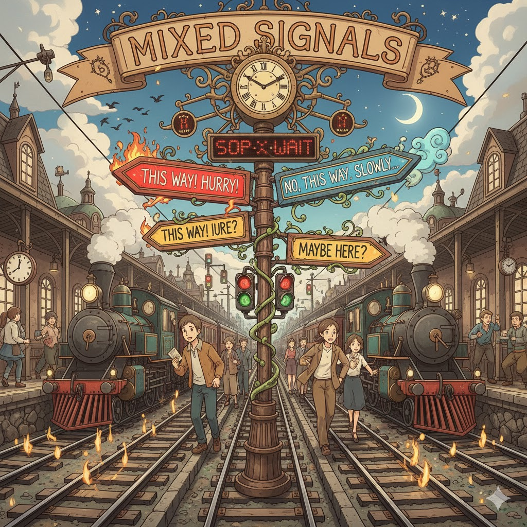 - 해석: 서로 모순되거나 일관성이 없어 상대방을 헷갈리게 만드는 정보나 태도. (인간관계, 심리 지문에서 중요)