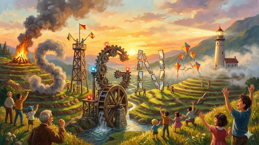 - 해석: 멀리 떨어진 곳에 정보를 전달하기 위해 불을 피워 연기를 이용하는 고대 통신 방식.