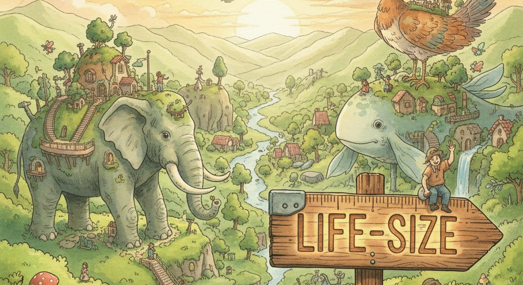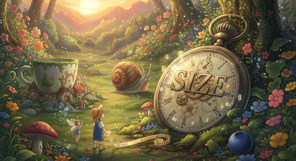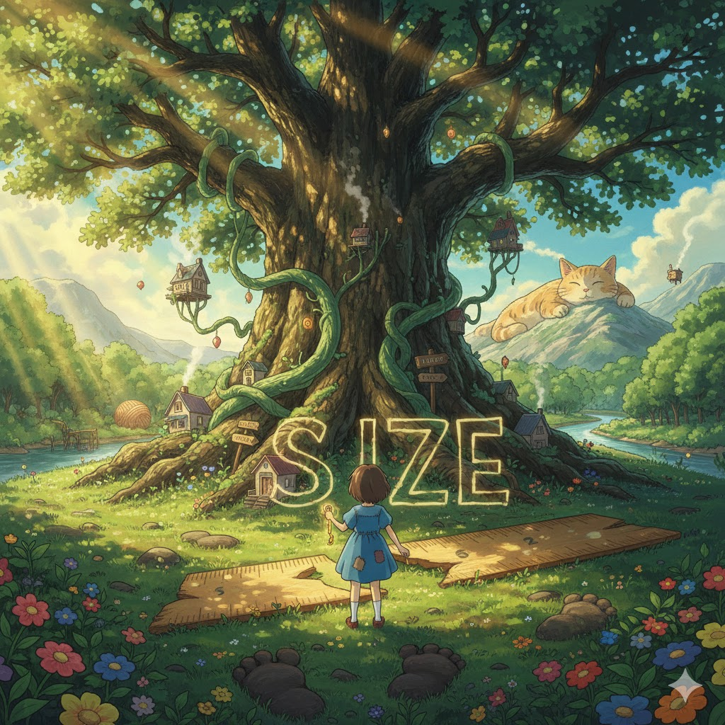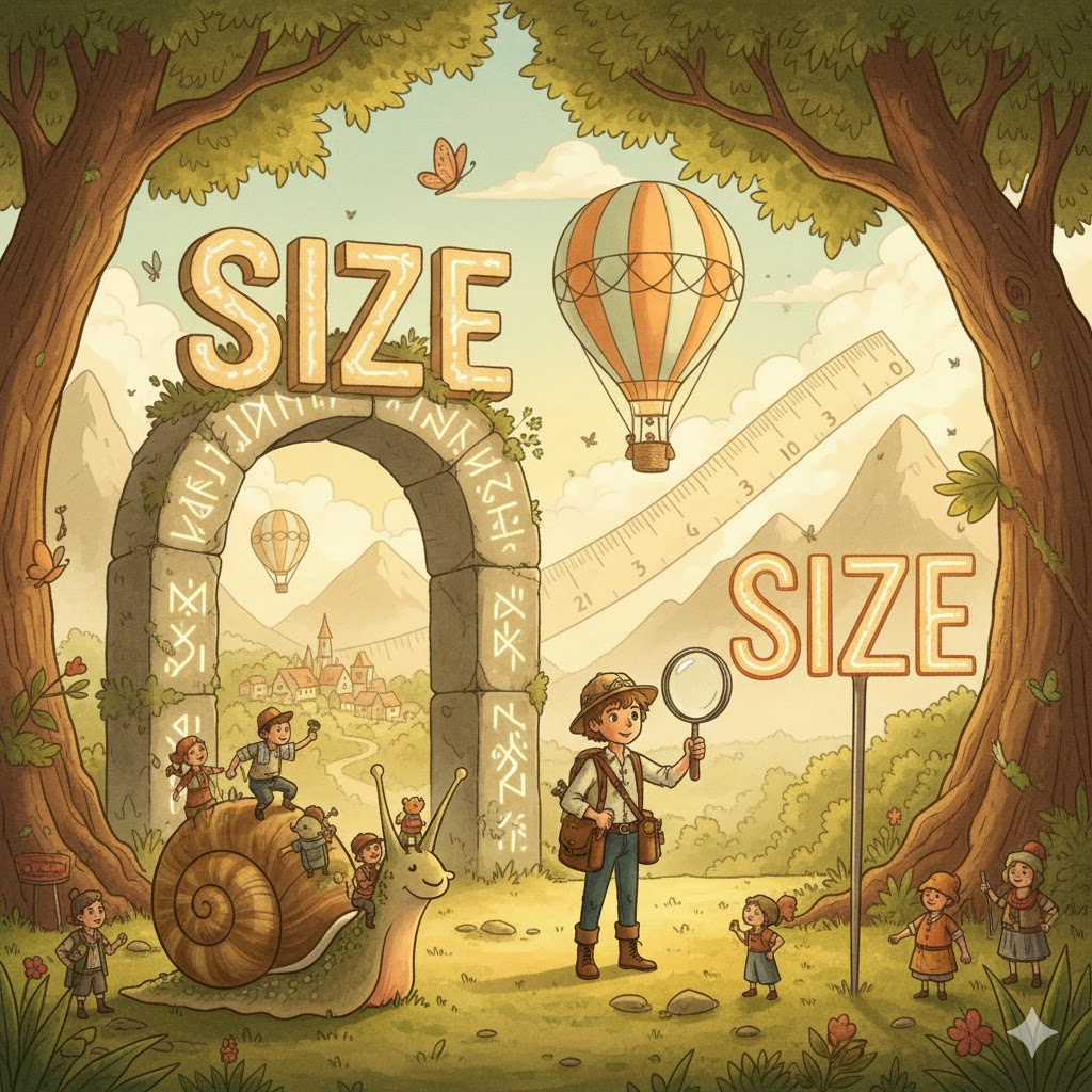 'size'는 크기의 기본 개념이며, 관련 숙어들은 '실물 비율', '범용성', '처리의 용이성'을 나타냅니다.