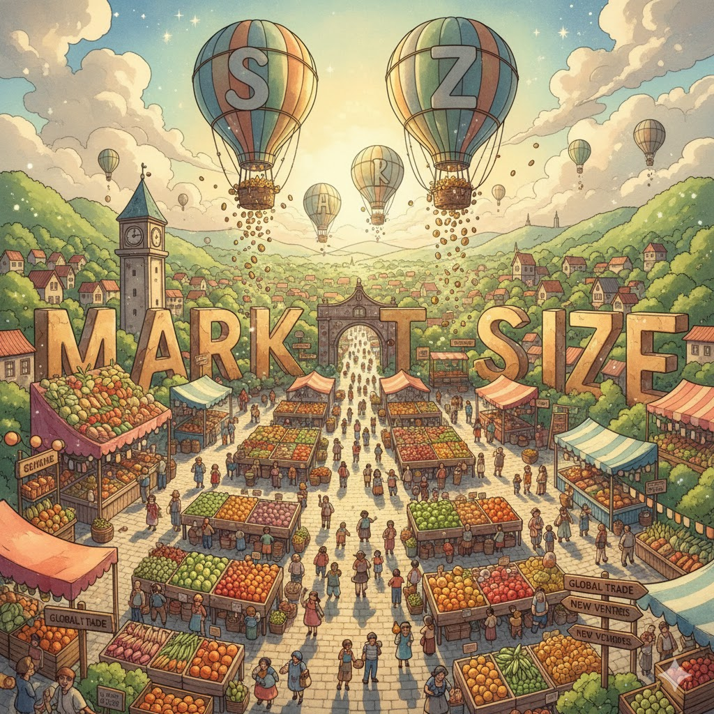 특정 제품이나 서비스에 대한 잠재적인 구매자 수나 총 매출액의 크기를 의미합니다. 사업의 성장 가능성과 투자 가치를 판단하는 중요한 경제 지표입니다.
