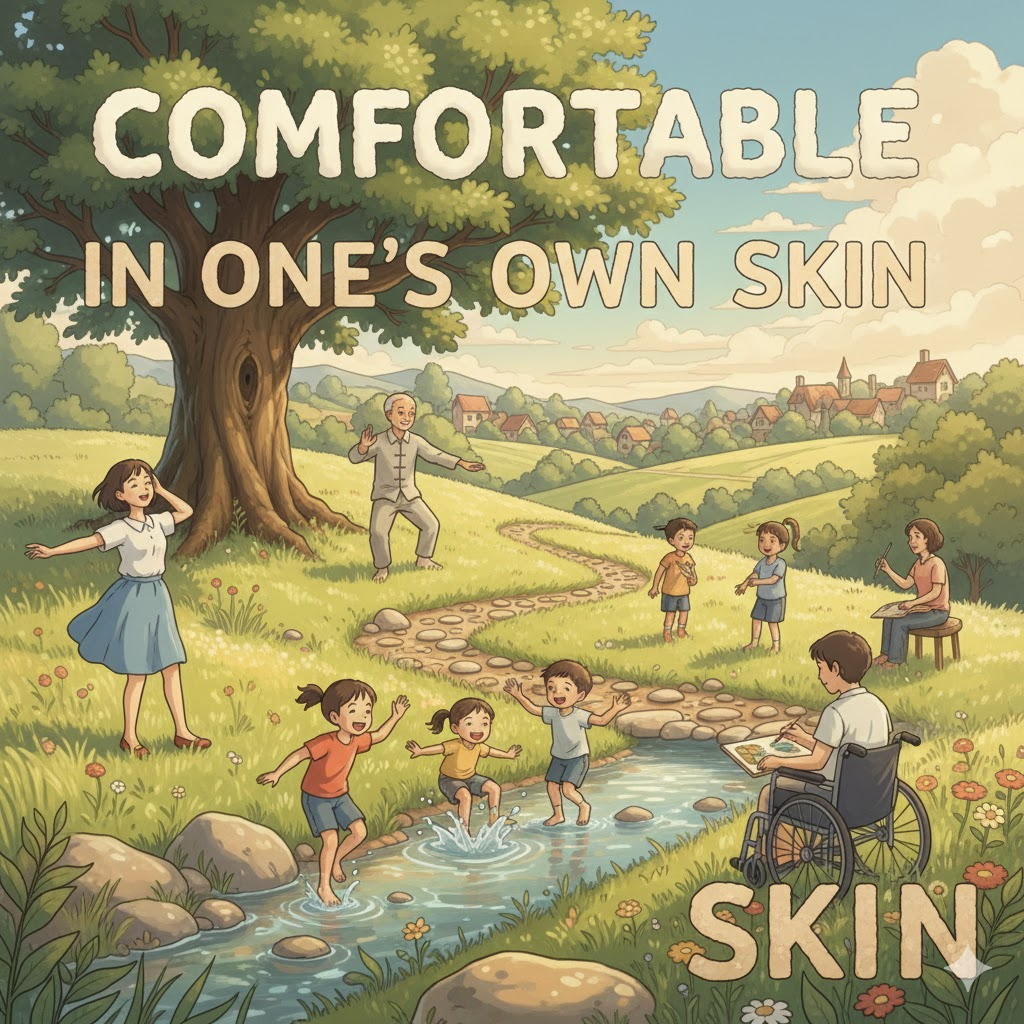 comfortable in one's skin [ˈkʌmfərtəbəl ɪn wʌnz skɪn]