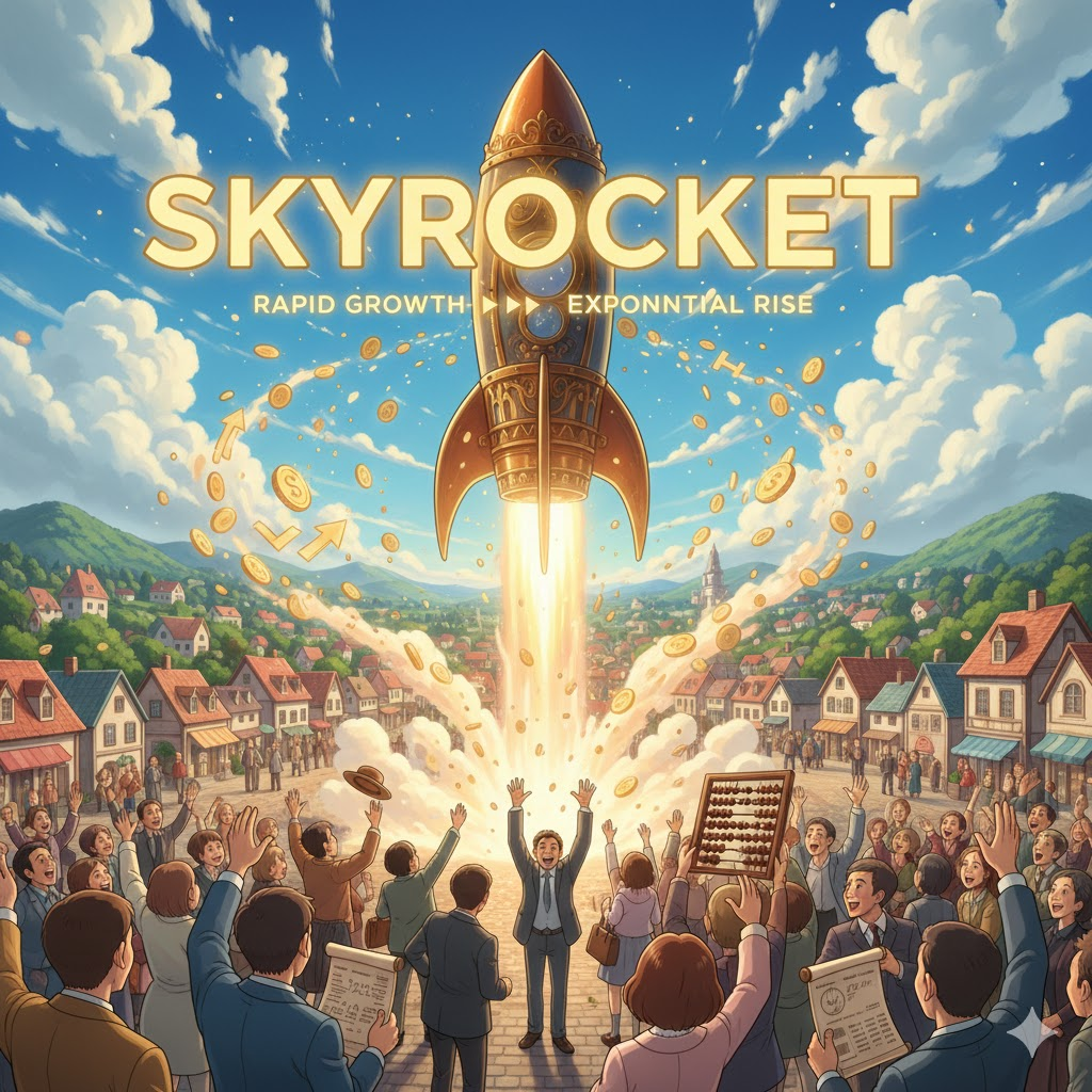 가격, 비용, 수치, 또는 인기 등이 하늘로 쏘아 올린 로켓처럼 매우 빠르고 가파르게 상승하는 것을 의미합니다. 통제하기 힘들 정도로 급격한 증가를 강조할 때 사용됩니다.