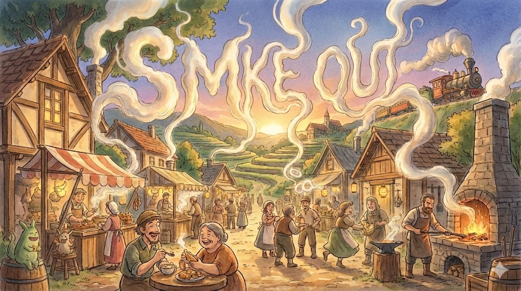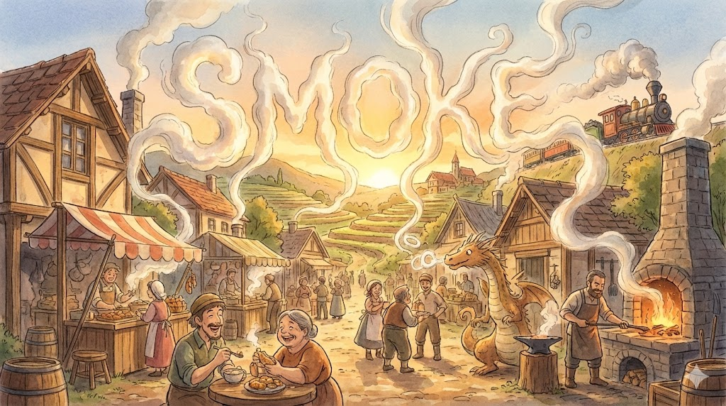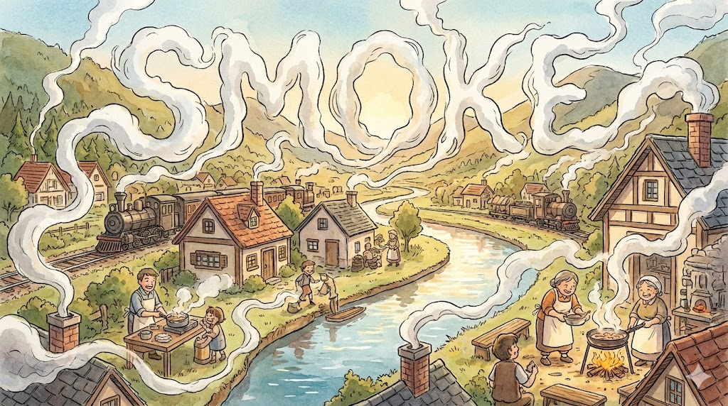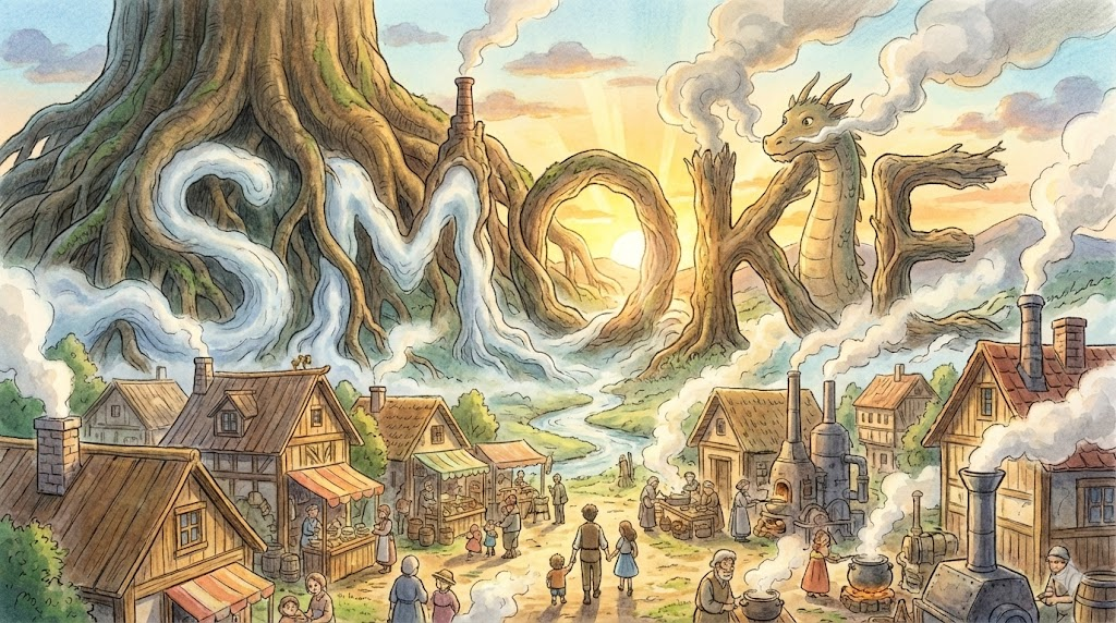 | 고대 영어 smoca (타는 것에서 나오는 깸) | "연소의 결과물" | (물리적) 연기 → 담배를 피우다 → (음식을) 훈제하다 → (시야를) 흐리게 하다 |