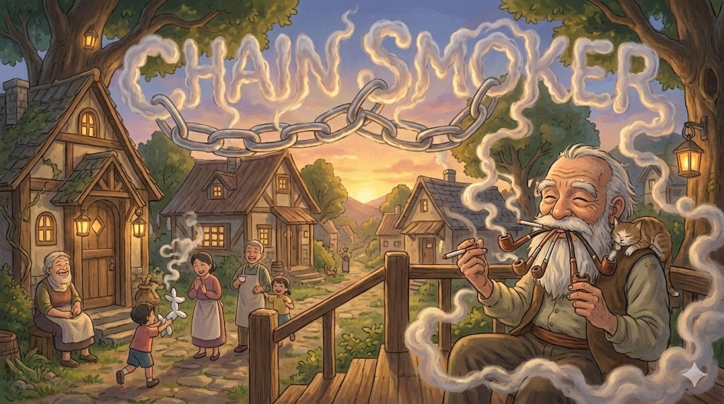 담배 한 대를 다 피우자마자 곧바로 다음 담배에 불을 붙여 계속해서 피우는 사람을 의미합니다. 쇠사슬(chain)처럼 담배가 끊이지 않고 연결된다는 데서 유래했습니다.