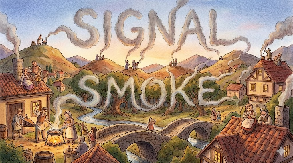 과거에 먼 거리에서 의사소통하거나 경고를 보내기 위해 불을 피워 연기의 모양이나 패턴으로 메시지를 전달하던 고대 통신 수단을 의미합니다. 비유적으로는 어떤 일이 일어날 것이라는 간접적인 징후를 뜻하기도 합니다.