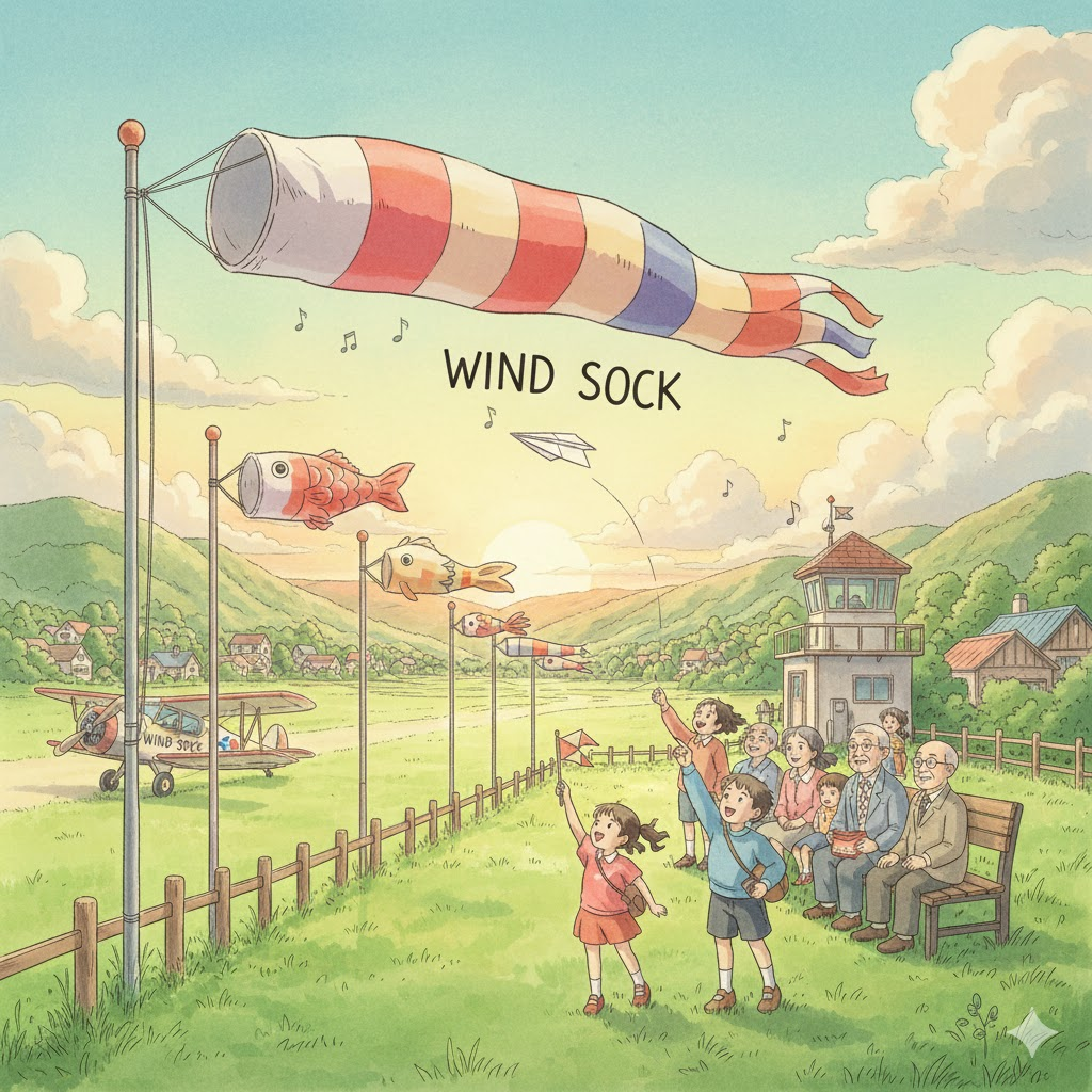 | wind sock | 바람 자루 | 명사로, '기상' '도구'. | '양말' '모양' '의' '자루' '가' '바람' '에' '날리는' '모습' '으로' '풍향' '을' '보여줌'. |