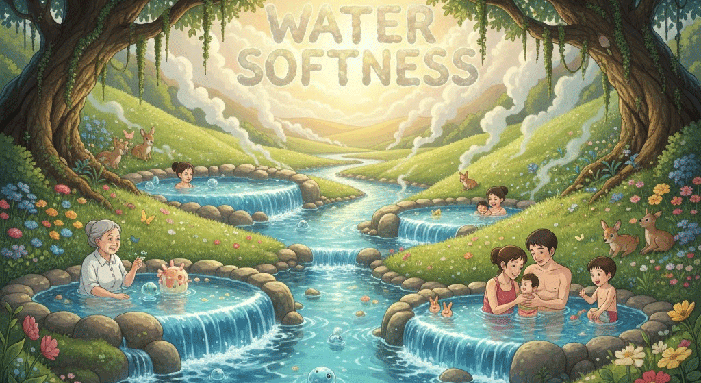 물속에 칼슘이나 마그네슘 같은 미네랄 함량이 적은 상태를 의미합니다. 비누거품이 잘 나고 피부에 자극이 적은 '연수(soft water)'의 화학적 특성을 강조합니다.