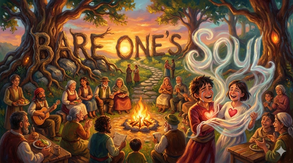 자신의 가장 깊은 생각, 감정, 비밀 등을 다른 사람에게 숨김없이 모두 드러내어 이야기하는 행위를 의미합니다. 매우 솔직하고 취약한 상태를 보여주는 것입니다.