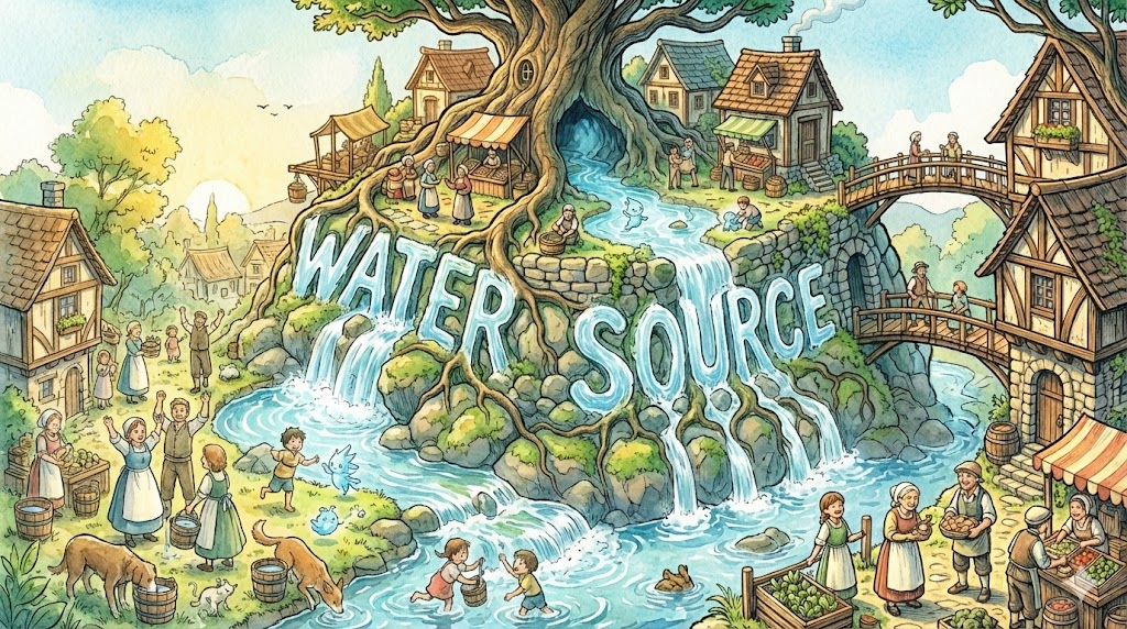 - 해석: 식수나 농업용수를 얻는 강, 호수, 지하수 등의 원천.