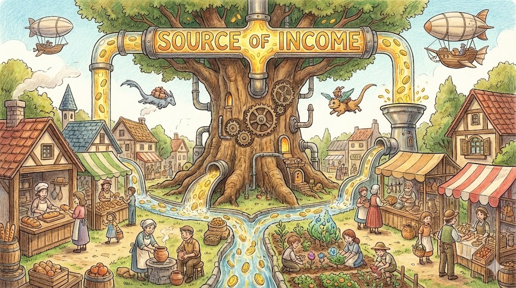 - 해석: 개인이나 기업이 돈을 버는 출처나 수단. (경제, 생활 지문에서 중요)