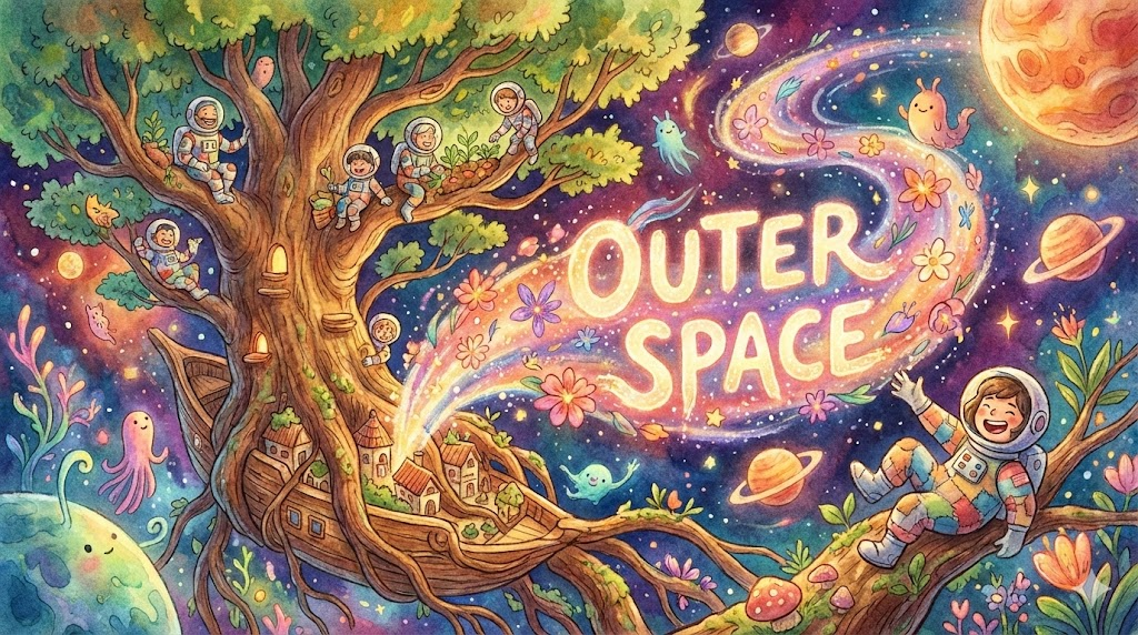 지구의 대기권을 벗어난, 별과 행성들이 존재하는 광활한 진공 공간을 의미합니다. 'space'만으로도 우주를 뜻하지만, 지구와 명확히 구별되는 바깥 영역임을 강조할 때 사용합니다.