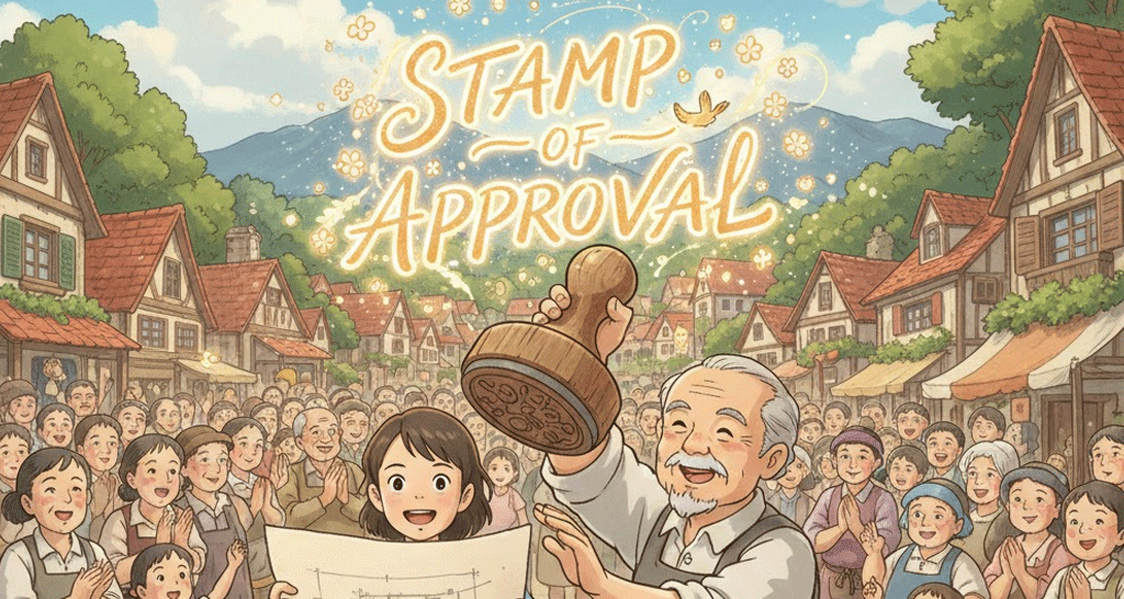- 해석: 어떤 계획이나 제품에 대해 공식적으로 허가하거나 만족함을 나타내는 표시.