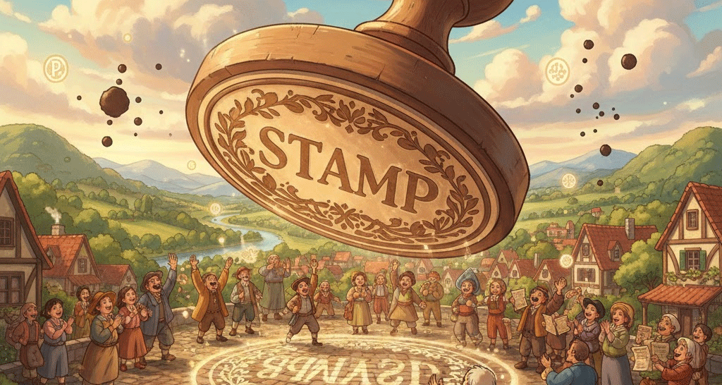'leave one's stamp'는 영향력을, 'food stamp'는 복지를, 'time/date stamp'는 기록을, 'stamp on'은 압박을 나타냅니다.