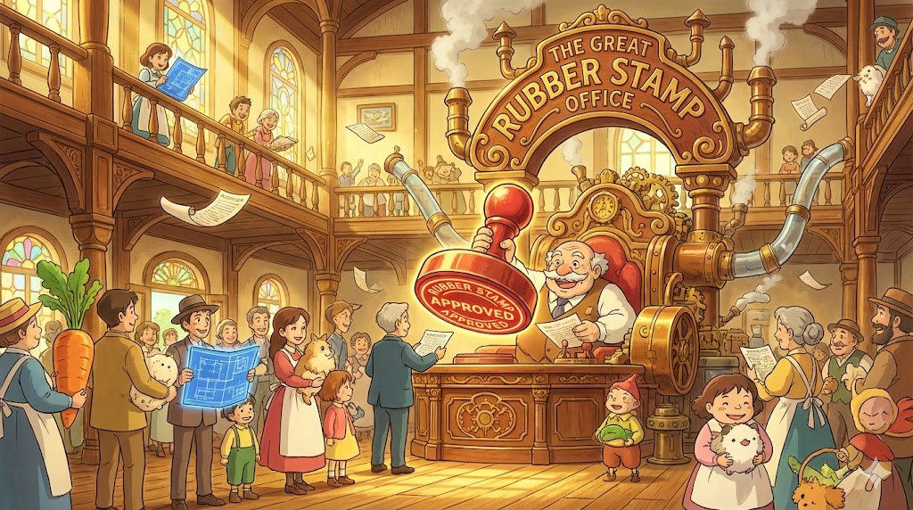 - 해석: 내용을 제대로 검토하지 않고 무비판적으로 승인하거나, 그런 역할을 하는 기관이나 사람. (비판적 맥락)