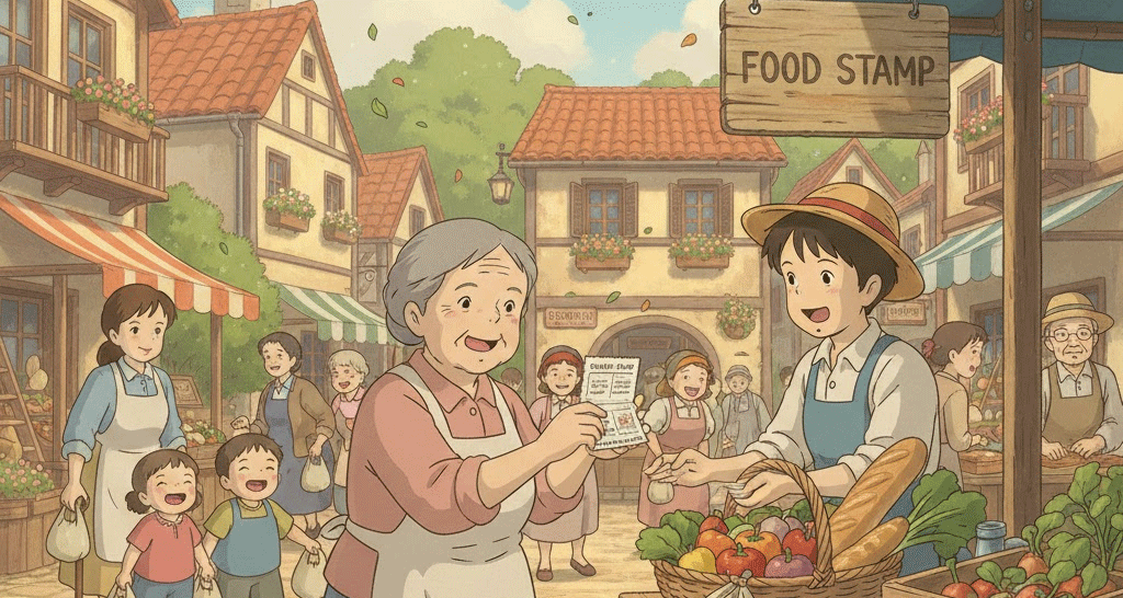 미국 정부가 저소득층에게 식료품을 구매할 수 있도록 제공하는 쿠폰이나 전자 카드를 의미합니다. 사회 복지 프로그램의 일환이며, 현재는 SNAP(Supplemental Nutrition Assistance Program)이라는 명칭으로 불립니다.
